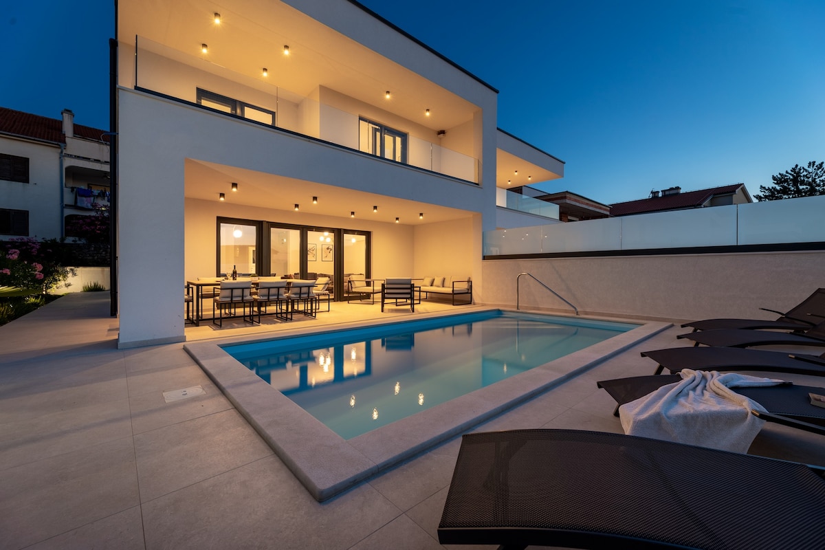 Nova 2025. vila s 5 zvijezdica u Crikvenici savršen je izbor za opuštajući odmor s obitelji ili prijateljima. Uživajte u velikom bazenu površine 40 m² s integriranom masažom, okruženom ležaljkama i prostranom terasom opremljenom roštiljem i vrtnim namještajem s pogledom na more i prirodu. Vila je klimatizirana u cijelosti, svih 5 spavaćih soba te dnevni boravak imaju vlastiti klima uređaj (ukupno 6). Gostima su na raspolaganju i stanice za punjenje električnih vozila.