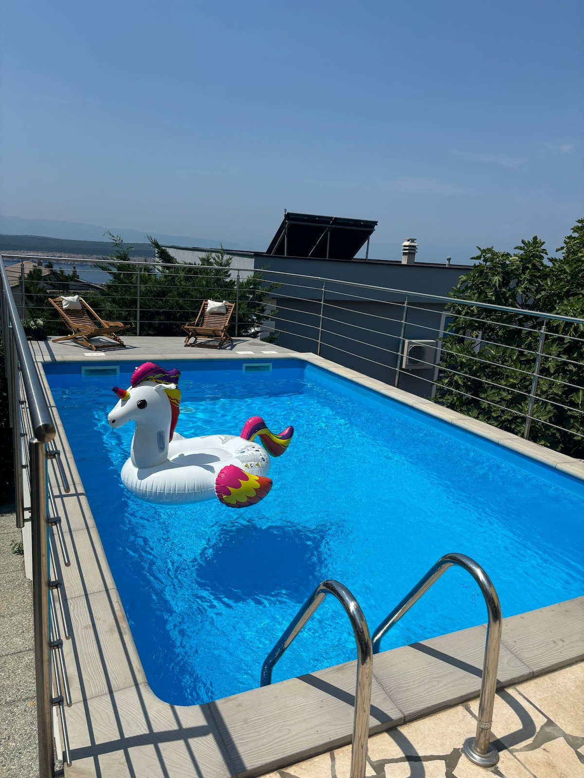 Opustite se sa svojom obitelji i prijateljima u ovom ugodnom smještaju. Lokacija kuće na mirnom mjestu, vrlo intimno, a udaljeno od mora i centra par minuta autom. Veliki grijani bazen 42 m2 u kojem se možete opuštati uz prekrasan panoramski pogled na more i otok Krk. Zalazak sunca je čaroban,a doživjeti ga možete s balkona ili iz bazena. Ķuća je novo sagrađena i opremljena vrlo moderno i kvalitetno, smjestena u Kvarnerskom zaljevu par kilometara od mosta za otok Krk(aerodrom)i grada Crikvenice.