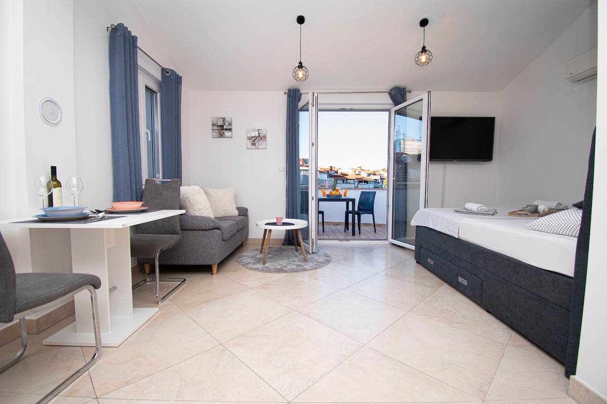 This unique place has a style all its own. Studio apartment with 80 square meters of terrace that is just for you. All the furniture is handmade, and the walls are decorated with photos of Pula. The old radio in the kitchen and the clock will give a touch of nostalgia. A stay in this studio is a truly special experience..