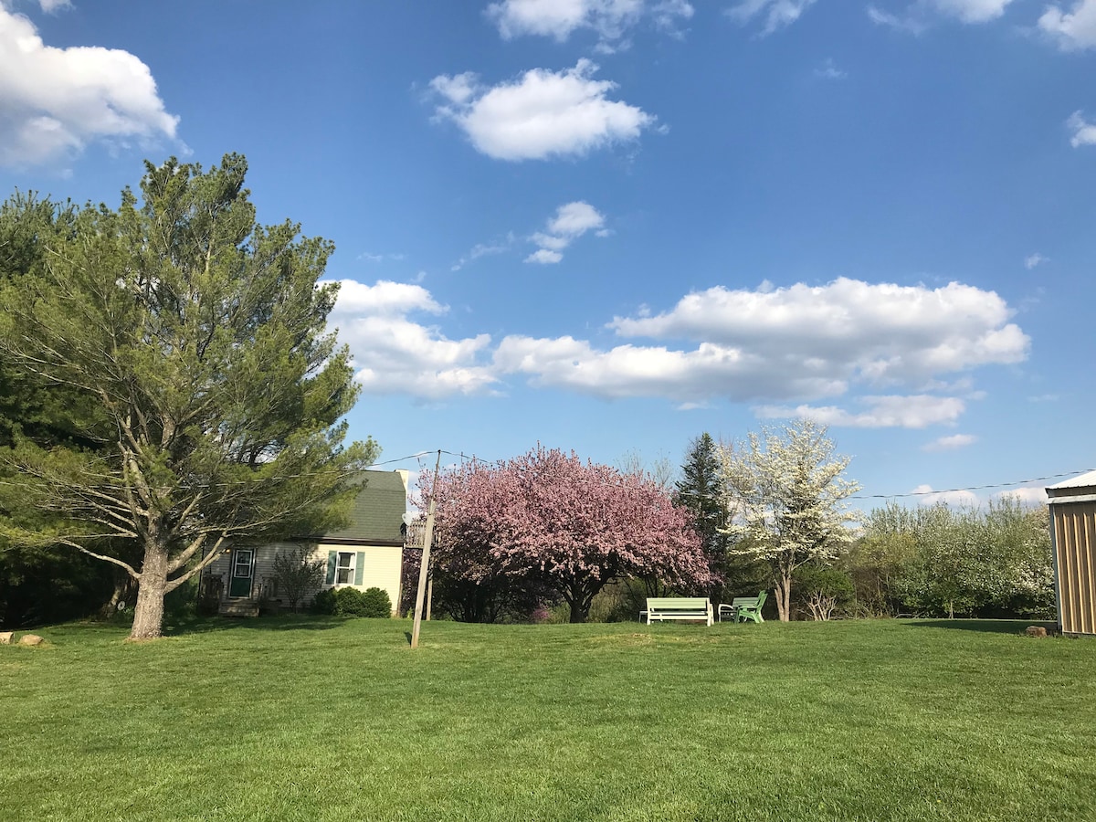 NO CLEANING FEE- 2 KING BEDROOMS & 1 QUEEN. Make our family Farm your family's favorite escape! *Main-living/dining room & kitchen. Tv with DVD & DirectTV. Well stocked kitchen with full size range and fridge with freezer, microwave, blender, toaster and KCuo/drip coffee pot. French doors open onto an elevated deck with patio furniture *Upper-1 king bedroom/1 queen. Half bath *Lower-king bedroom, small gathering area, full bath. French doors leading to covered patio with hot tub.