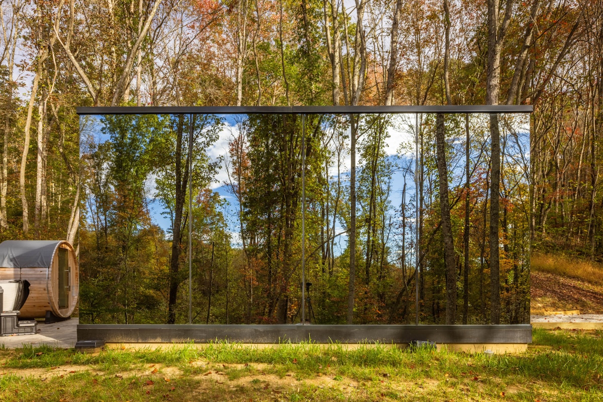 The floor to ceiling windows of this modern wooded cabin provide the full experience of being immersed in nature while having the comforts of home. This home comfortably accommodates 8 people and features 2 bedrooms, a loft with additional sleeping space, and 2.5 bathrooms. The spa-like primary bathroom, suspended wood burning fireplace, and outdoor living areas make this cabin the ultimate escape. This specific cabin is conveniently located near our communal outdoor sauna pods.