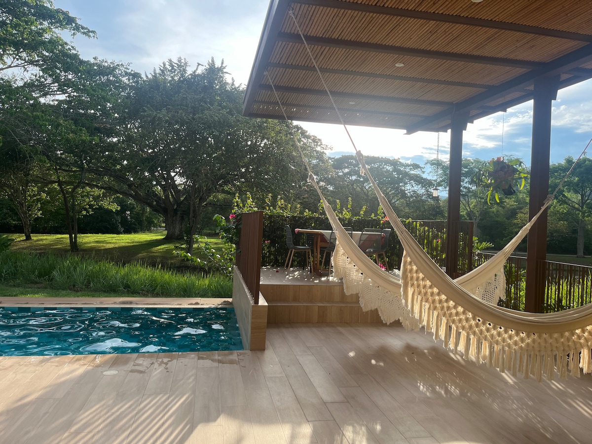 La casa es de espacios amplios, grandes ventanas, rodeada de naturaleza y un clima perfecto que se mantiene entre 30º-35º. Piscina, Wifi , Cocina integral totalmente dotada, amplia zona de parqueo gratuito, Jacuzzi, lavadora y/o secadora, ventiladores de techo, Smart TV acceso sin restricción de horario. Las mascotas son bienvenidas. Los huéspedes pueden utilizar las instalaciones deportivas, zona social ,bar y restaurante de Mesa de Yeguas Club Campestre, en calidad de invitados.