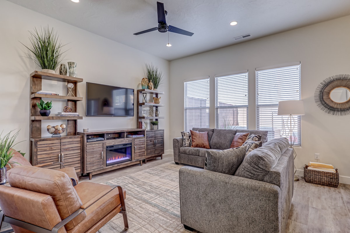 New listing, St. George/Washington City (formerly RAD retreat on Airbnb) • Private back patio with hot tub and gas firepit • BBQ • Community Pool • Close to Zions National Park, Sand Hollow Reservoir, Golf Courses, Tuacahn Outdoor Amphitheater, ATV trails, & much more • 3 luxury beds (2 Kings, 1 queen, pull out queen in the upstairs couch and an air mattress to accommodate a few more) • Modern décor • 2 car garage • 70 ‘ Smart TV