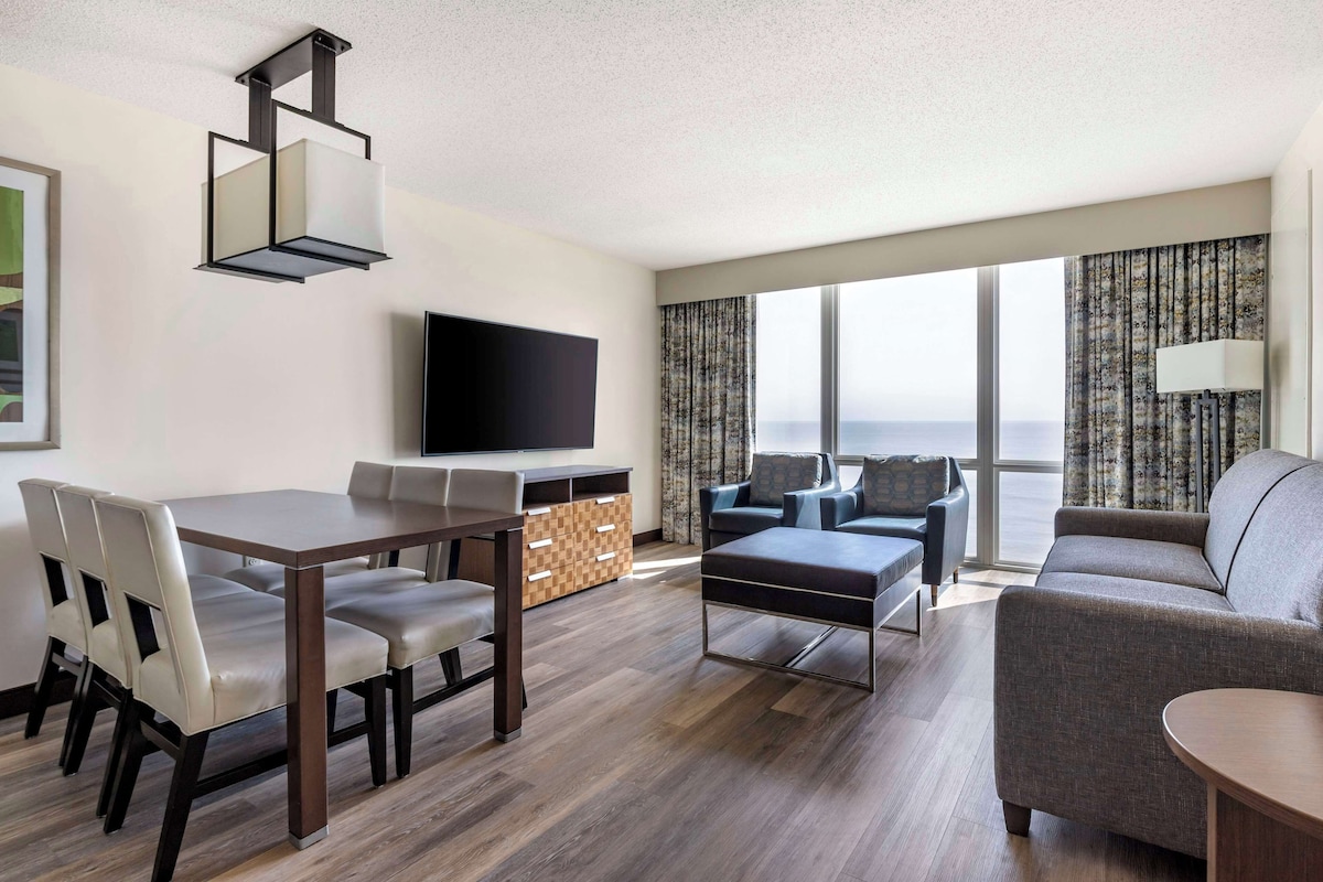 Stay in an upscale resort that’s near everything you want to visit. Begin your luxury oceanfront vacation at the Hilton Vacation Club Ocean Beach Club resort with contemporary tropical decor, exceptional guest service, and the best collection of amenities and services including indoor and outdoor pools, kids pool, Tortuga's Tiki Bar, and a state-of-the-art fitness center. This is priced for a 2BR lockoff unit, but you can ask me about paying less for the 1BR or studio for less if you prefer.