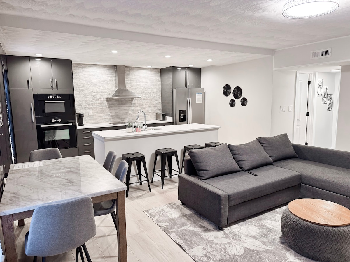 Fantastic condo on the beach. Floor to ceiling windows in living-room, bedrooms. Watching waves, sunrise, dolphins. Enjoy the ocean, boardwalk, beach gym, playground right at downstairs. Extra-large end-unit with fully equipped kitchen, saves you $$$ on meals. One free parking. Walking distance to restaurants, bars, stores, beach concerts, activities, art shows, performance. New 65” QLED TV, new sofa and dining set. Ask for extended stay discount! Up to 45% off Winter Special Deals. Book now!