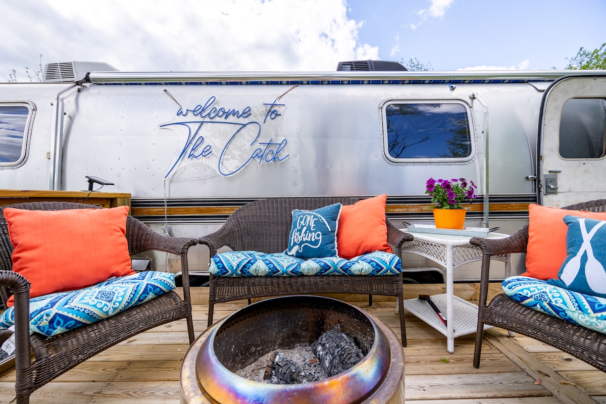 Renovated 1965 Airstream sits Lakefront w/ all modern conveniences, including fully stocked kitchen, full bath, AC, and Heat. Across from a waterfall on an 8 acre private Lake with your own beach, dock, and Kayaks. Nestled into the forest on our farm and surrounded by 142 wooded acres with 5+Miles of Hike/Biking trails. Enjoy Swimming, Kayaking, Fishing, Hike/Biking, visit Farm Animals, or just RELAX! Only our Family, Log Cabin, Tugboat, and Silo listings have access to the Lake and Property.