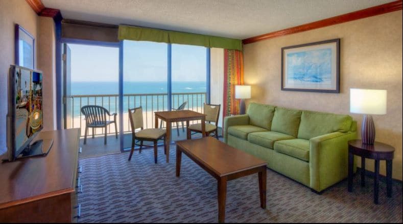 Oceanfront 6th Floor Balcony One Bedroom Sleeps 6 Size 455 ft Free WiFi, cable & flat screen TV, sitting area and pullout sofa bed. Private kitchen: Refrig, Microwave, Stovetop, Oven, Kitchenware, Dishwasher. Private bathroom: Bathtub, Free toiletries, toilet, Shower. Facilities: Linens, Alarm clock, Tea/Coffee maker, safe, Air conditioning, Free public parking. Loaded with Resort amenities. Outdoor/Indoor pools. Bar, Tennis, Exercise facility, programs and activities for all ages. Trolley