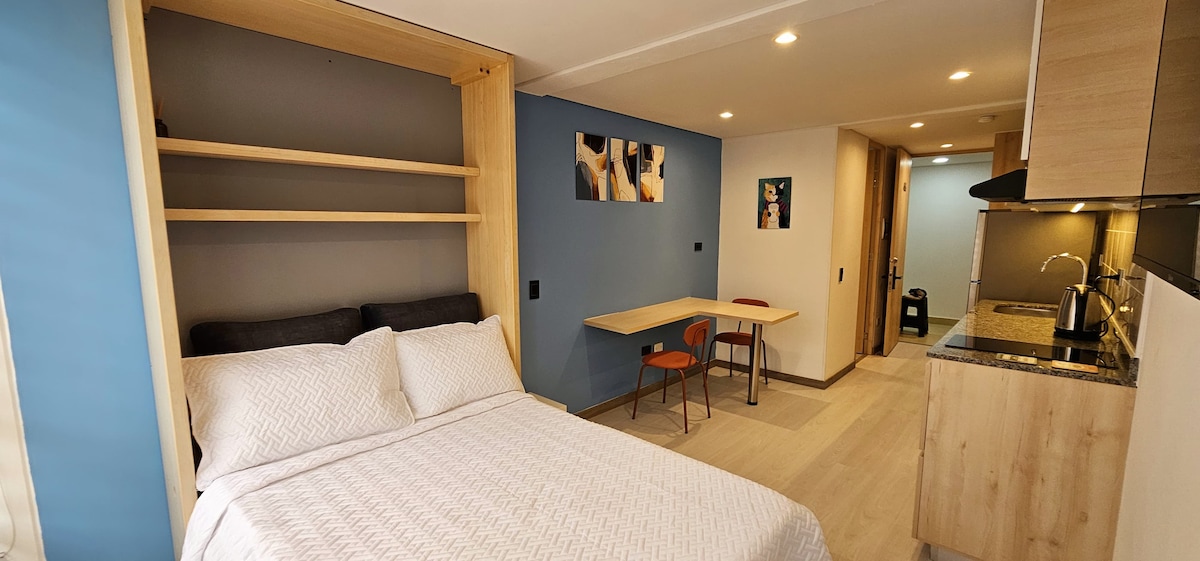 Espacio moderno, tranquilo y estratégico en el barrio Spring (norte de Bogotá). A 3 cuadras de TransMilenio Alcalá y cerca a la calle 134. Ideal para ejecutivos o estancias confortables. WiFi alta velocidad, chimenea a gas, lavadora, secadora y parqueadero cubierto. Edificio con ascensor y zonas comunes (terraza BBQ y salón). Cuenta con acogedor altillo tipo loft que hace la experiencia única (acceso por escaleras plegables) Más de 100 reseñas y calificación 4.9 garantizan calidad.