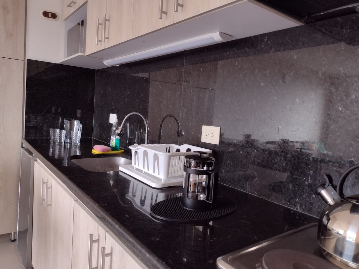 Aparta estudio decorado con estilo y la mejor comodidad para nuestros visitantes. Ubicado en el corazón de modelia, cerca al terminal de transportes, Aeropuerto, supermercados, restaurantes, bancos y la zona rosa. No contamos con elevador. SERVICIOS INCLUIDOS Gym Terraza Área de juegos Desayuno Incluido 7-9am Lunes - Sabado NO Domingos ni festivos. SERVICIOS CON COSTO ADICIONAL Sala de juntas Mini bar 2 parqueaderos cerca, ubicados a 2 cuadras del edificio. No contamos con convenio