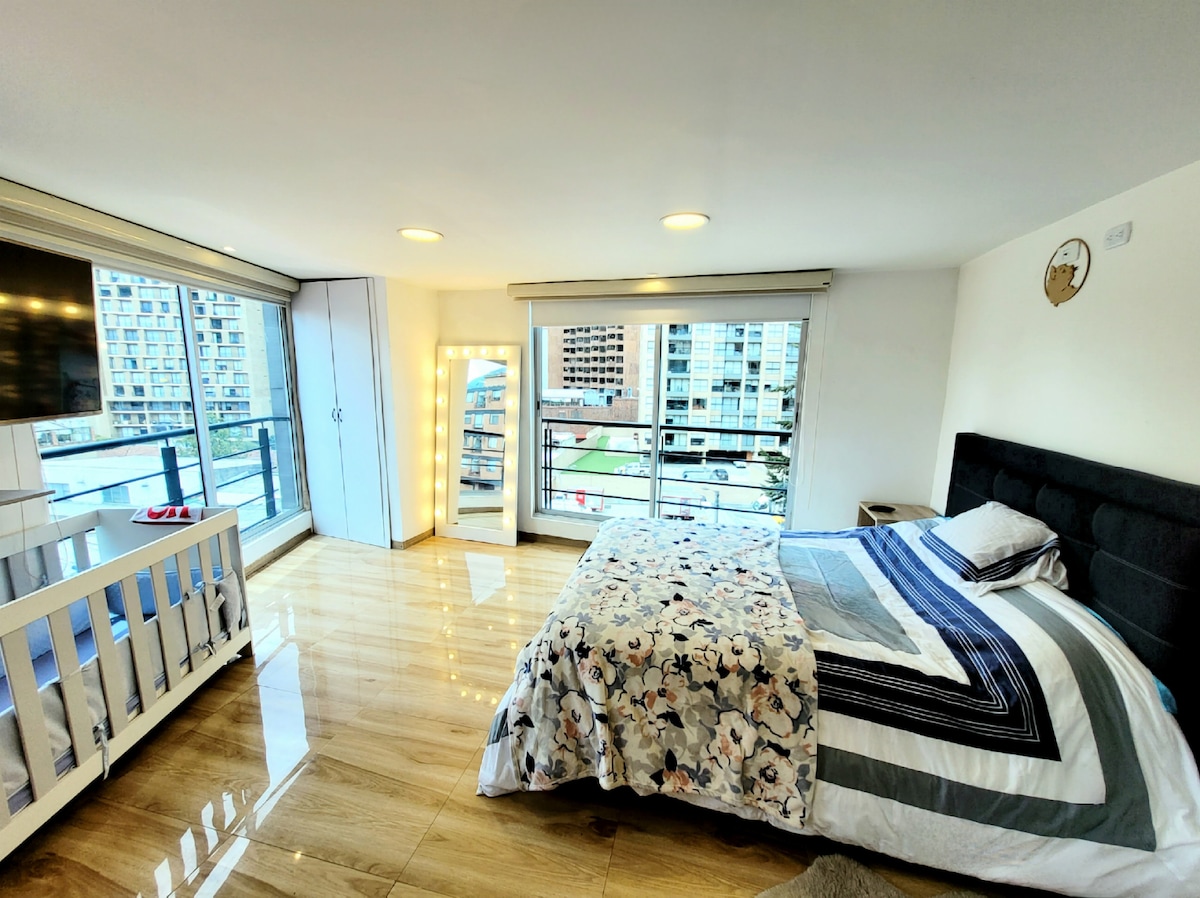 Loft moderno y luminoso, con balcón y vista al atardecer, ideal para ejecutivos, nómadas digitales y parejas. Cuenta con cocina equipada (airfryer, nevera, prensa francesa, estufa, etc.), Wifi, monitor externo, proyector con juegos retro y acceso a Netflix, HBO, Disney+ y más. El edificio ofrece rooftop 24/7 con vista 360°, zona de BBQ y yoga, gimnasio, coworking y zona de juegos, en una ubicación privilegiada cerca de Parque de la 93, Zona T y principales vías y estaciones de TransMilenio.