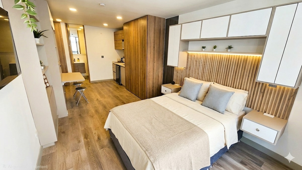 Moderno estudio en El Chicó, ideal para 1 o 2 personas. Cocina equipada, baño privado, smart TV y ventanal con luz natural. El edificio ofrece coworking, gimnasio, lavandería y una terraza con vista panorámica. Excelente ubicación, cerca de restaurantes, transporte y zonas empresariales. Perfecto para estancias cortas o largas.