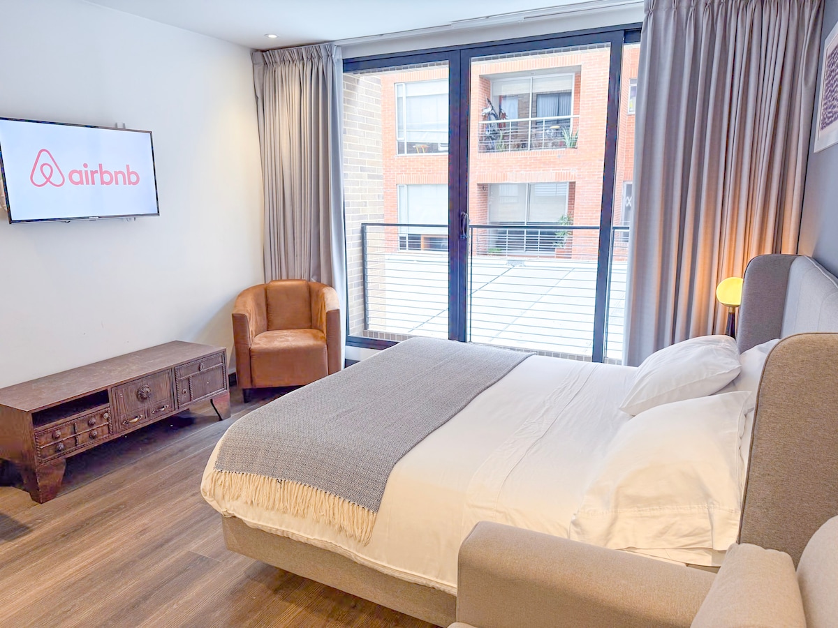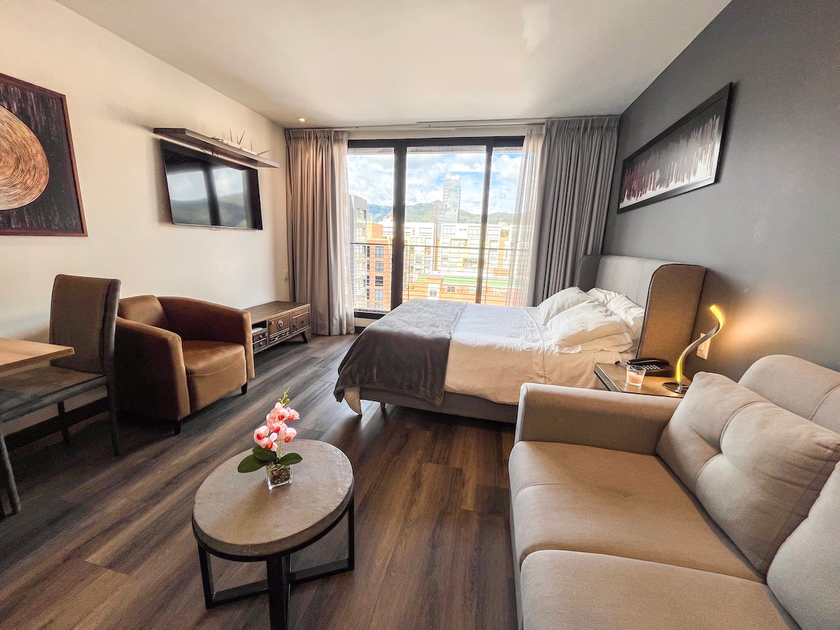Apartamento moderno edificio nuevo año 2025, de una habitación con hermosa vista a la ciudad en el exclusivo barrio Virrey en Bogotá. Disfrutarás en pareja o con tu familia de un espacio de lujo totalmente amoblado, un baño completo y baño social, televisión inteligente, lavandería, wifi rápido, espacio de trabajo, una espectacular cocina con todos los electrodomésticos necesarios para tu estadía, en el edificio tendrás zona de coworking. Tienes a un paso el parque virrey.