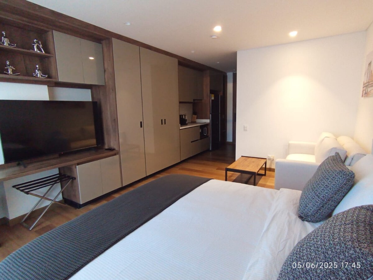 Vive una experiencia increíble en este nuevo Loft de lujo. Con acabados de diseñador, está equipado con una cama doble, WiFi, TV, microondas, waflera, cafetera, nevera, cocina, Escritorio, luz natural, una vista increíble y grandes comodities. Ubicado en un elegante edificio con excelente ubicación cerca de geniales restaurantes, centros comerciales, vías de acceso y transporte público. El edificio cuenta con cuarto de lavadoyplanchado, coworking, terraza 360, área de ejercicios y seguridad 24 h