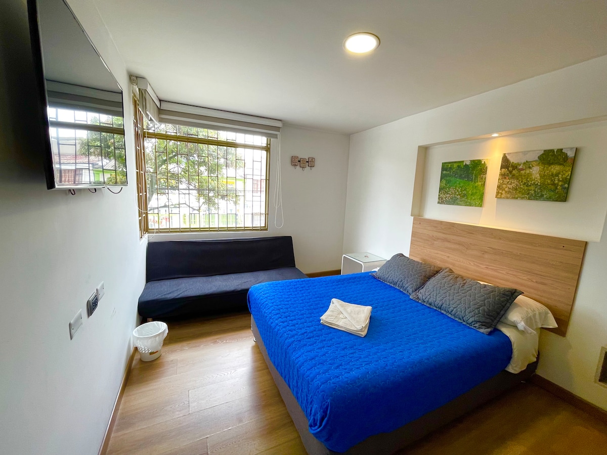 Room in a boutique hotel located in the Palermo neighborhood of Teusaquillo, in a residential area, minutes' walk from the Palermo Clinic, the city center, El Campin Stadium, the Movistar Arena, and the airport. The room features a private bathroom, desk, 32-inch smart TV, and smart locks. Night security.