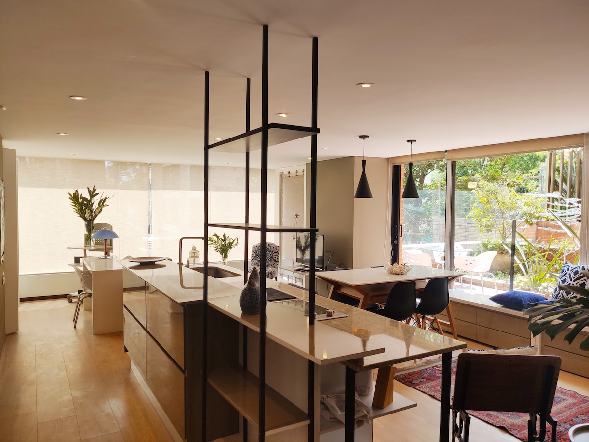 Obra del aclamado arquitecto Franz Adolphs, este goloso apartamento de grandes hechuras, frondoso jardín y envidiable ubicación es una sabia combinación de piezas de diseño con materiales nobles y formas inesperadas. Tienen el apt dotado de todos los utensilios de cocina para preparar sus alimentos .se presta servicio de limpieza y cocina x 50 mil pesos diarios El apartamento queda a 5 minutos caminando al parque de la 93 y 2 minutos parque del chico la zona está llena de restaurantes y diversión Todo el apartamento, es de uso para el huésped Servicio de limpieza ,cocina , ropas etc , por un costo de 60 mil diarios A escasos minutos andando de numerosos parques, ciclorrutas y una animada zona comercial, este exclusivo apartamento es un oasis apacible tentado por una vasta oferta cultural y de ocio. En la carrera séptima está las estaciones del bus urbano Por toda la zona es fácil y seguro andar en bici , baja la aplicación de SITP y recorre la ciudad . La ubicación del apartamento es perfecta para negocios o placer