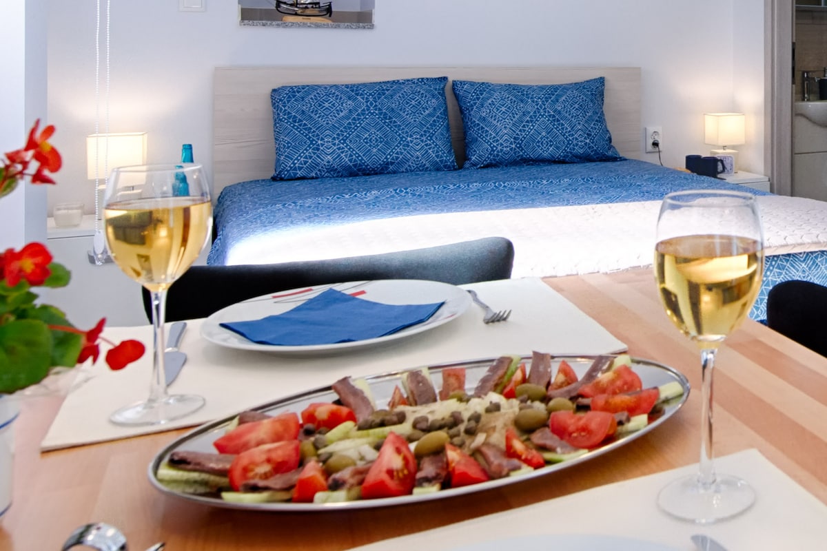 This newly renovated studio apartment is situated on a very quiet location within a private garden, just a few steps away from the sea. The apartment is fully equipped, air conditioned, has a smart TV, wi-fi and a lovely terrace perfect for dining al fresco. It also offers a private parking. The local shops and restaurants are only a 2 minutes stroll away.