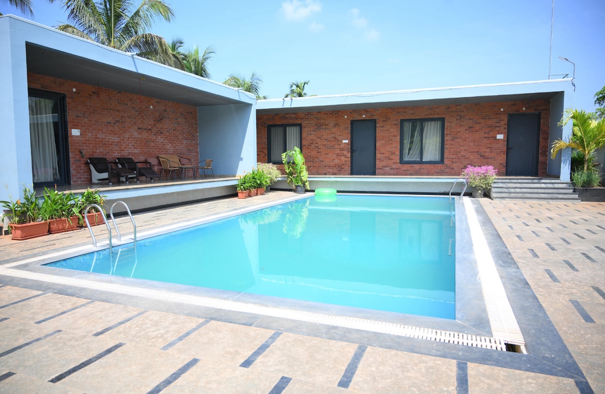 Bring the whole family to this great place with lots of room for fun.located very near to beach .accessible to multiple restaurants.for more details .price quoted Airbnb is for 4 people .extra 500 for each extra guest .property can accommodate up to 8 guests .pets allowed at extra charges of .₹.500 each .contact :950290four 100 / 9676one 28999z