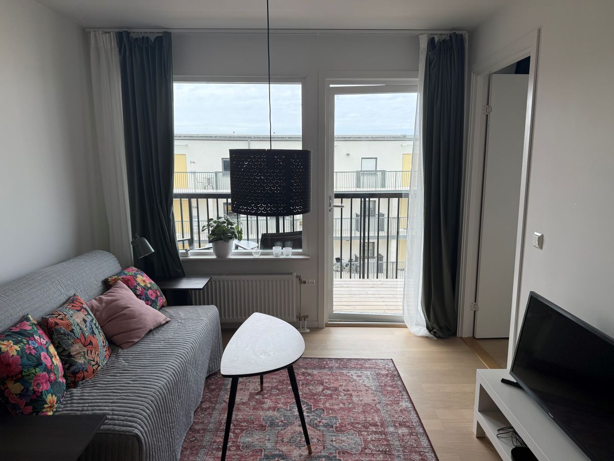 Gästlägenhet, ett stort rum med en 140 cm bred säng och en bäddsoffa som bäddas ut till 160 cm bredd. I rummet finns matbord för 4 samt en köksdel med kylskåp, frys, spis-ugn, mikro, kaffebryggare samt det som behövs för enklare matlagning. Badrummet har wc, handfat, dusch samt tvättmaskin. Läget är exceptionellt i en av Visbys vackraste gränder. Nära Kruttornet, Strandpromenaden, Almedalen, Kallis, Botaniska trädgården och Stora Torget. Lakan och handdukar ingår inte. Slutstädning ingår.