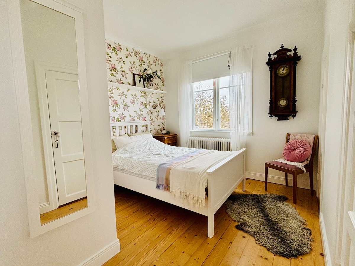 Sekelskiftesvåning från 1890-talet med makalös utsikt över Visbys takåsar, hamnen och havet. Genomgående lägenhet med fönster i alla riktningar, kakelugn, högt i tak och härliga ljusinsläpp från alla rum med stora fönsterpartier. 4 sovrum med plats för 6 personer, arbetsplatser/skrivbord i varje rum. Ytterligare en arbetsplats i ”studion” där även piano finns att tillgå. WiFi och Streaming-kanaler för TV och Musik. Badrum med badkar och dusch samt ytterligare en gästtoalett. Underbar trädgård.