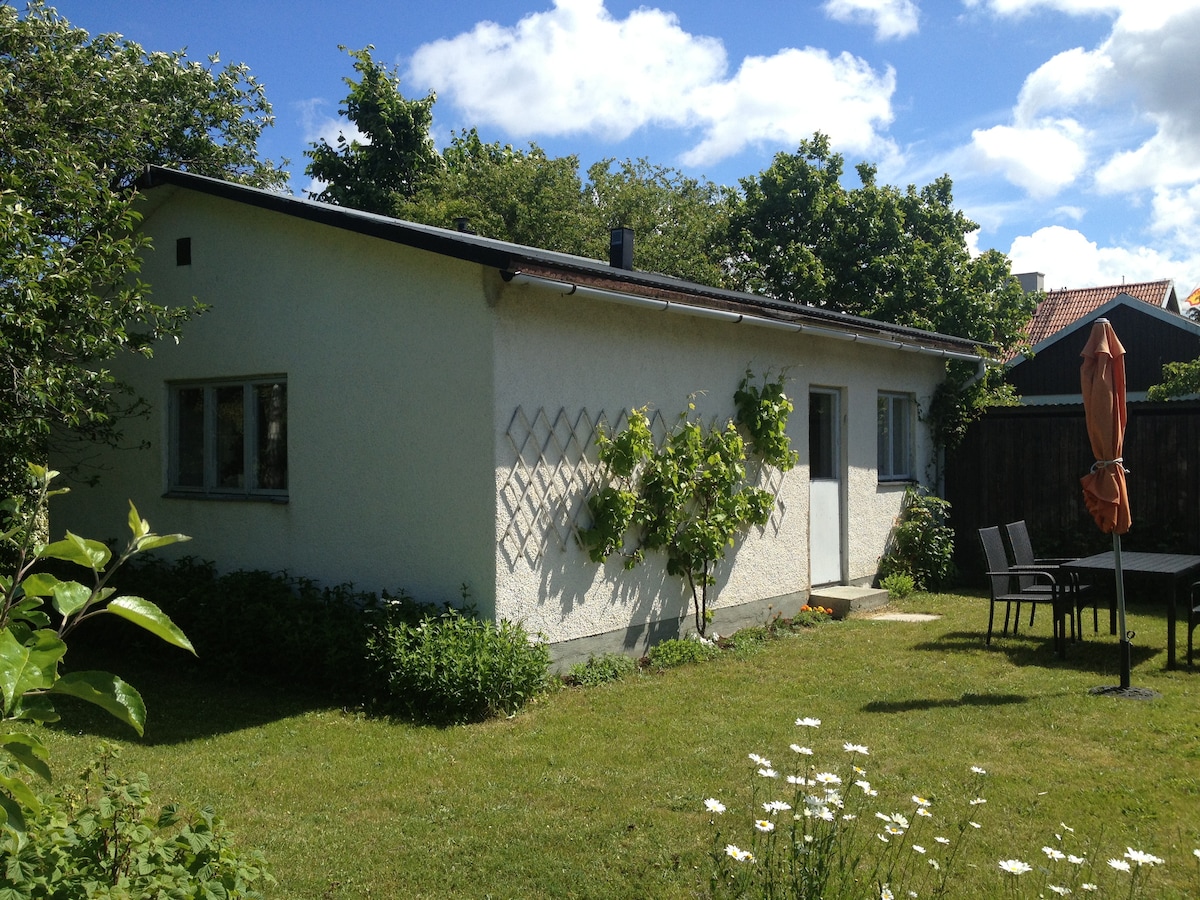 Nybyggt litet gårdshus i Visby (40 kvm). Centralt och lugnt läge med 10 minuters promenad till innerstaden. Separat sovrum anpassat för två 80 cm breda sängar. Inget utrymme för spjälsäng eller barnvagn. Allrum med matplats. Stilfullt möblerat. Köksavdelning med kyl/frys, micro och diskmaskin. Egen stensatt uteplats. Parkering kan lätt hittas utanför huset då det är villaområde.