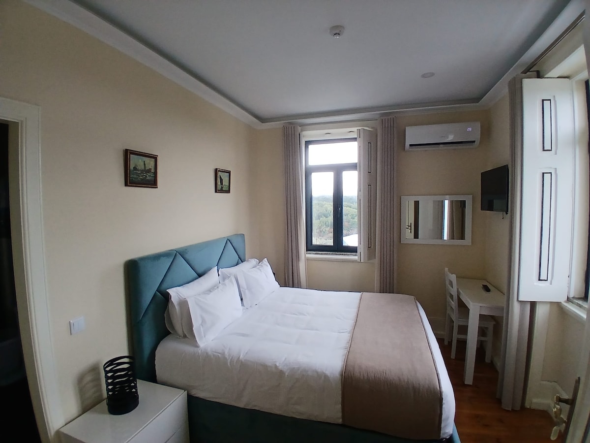 Este quarto oferece o conforto de uma cama de casal e uma casa de banho privativa, garantindo privacidade e comodidade durante a sua estadia na Casa Dona Edite. Além disso, desfrute de uma vista deslumbrante para o Vale do Douro, proporcionando um ambiente tranquilo e inspirador para os nossos hóspedes. A piscina é para todos da Guesthouse.