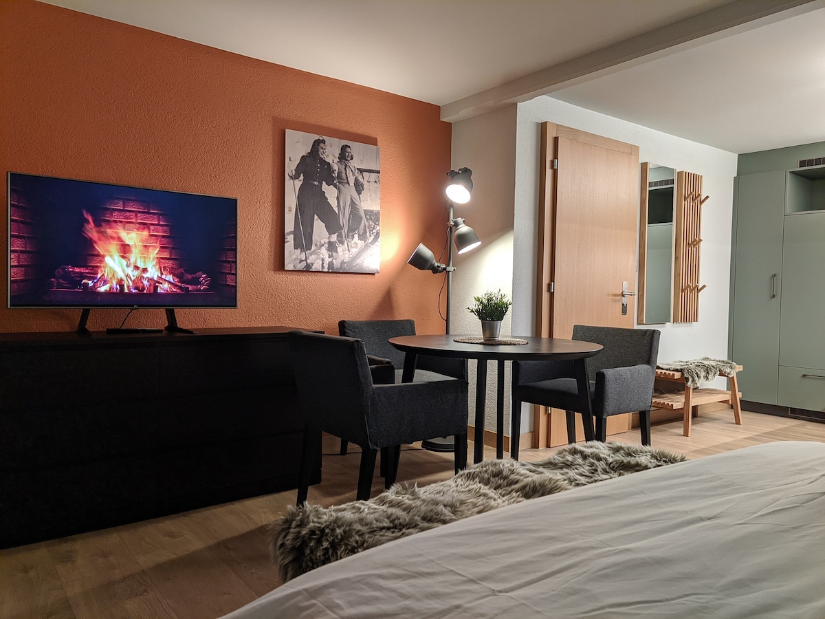 Peaceful and charming studio with a partial view to the Matterhorn. Nicely located at 4 minutes walking from Sunnegga lift. It is a comfortable and generous studio of 36sqm perfect for 2 or cute and cosy for 4. Fully equipped and newly refurbished. The kitchen is fully equipped including dishwasher. The main room has SMART TV (49 inches) and wireless internet connection. Please note there is 120 meter path/slope (approx 2minutes walking) from the road to the flat to access the flat.