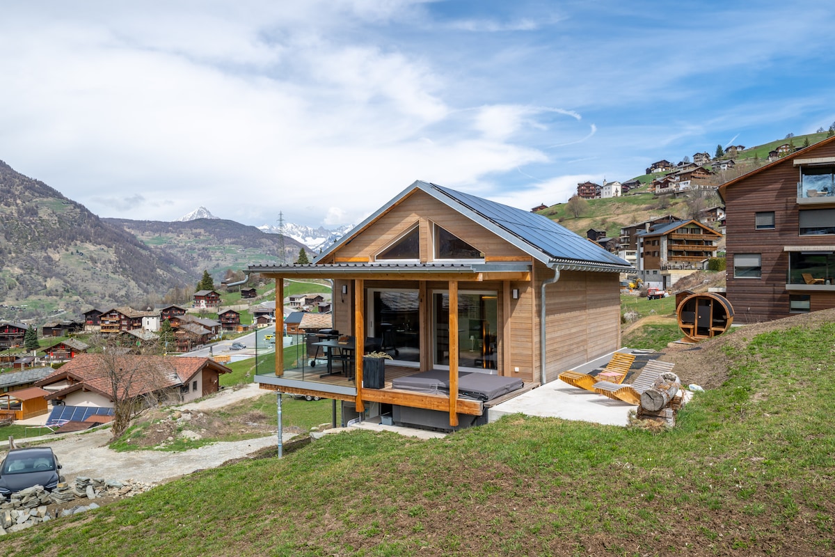 Penthouse studio with 100m2 terrace, uninterrupted views of the Alps and PRIVATE hot tub. Indoor space composed of an open living and dining room with a folding murphy bed (180cm), large screen TV, full bathroom and a cozy office. The kitchen has everything you need. Outside, the terrace and views await. An outdoor dining table, hammock and fire bowl invite you to relax. Close access to Gemmi & Torrant cable cars and thermal baths.