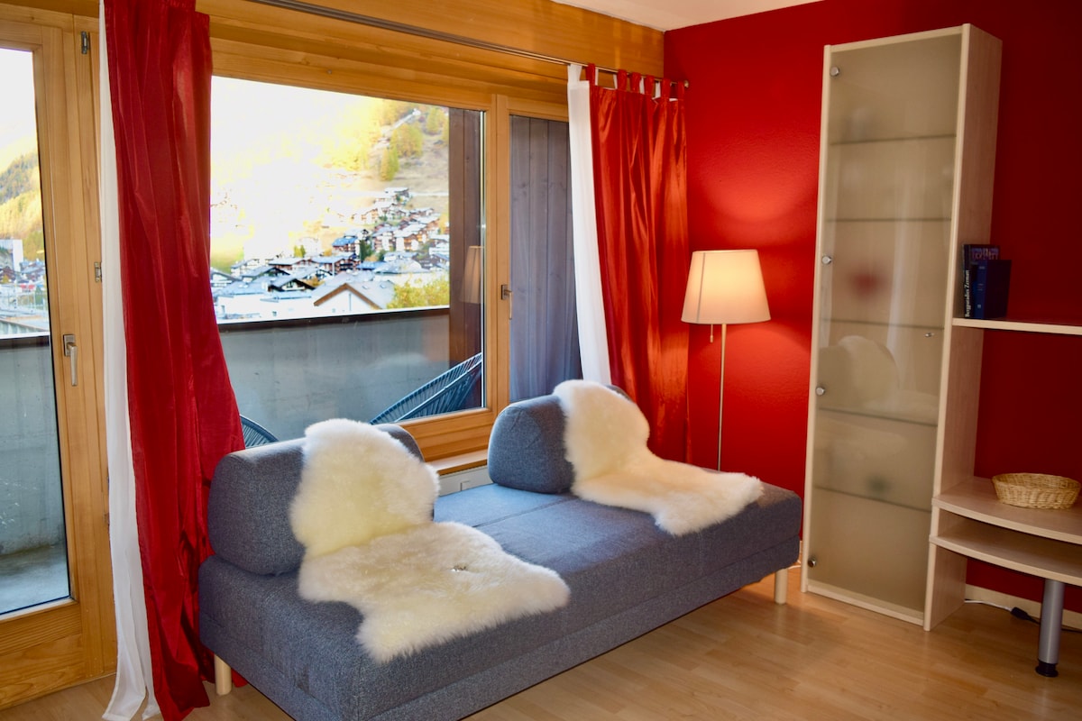 The studio is located in the center - 3 minutes walking distance from the train station and, from the Gornergrat station. It is spacious and bright with a nice relaxing view. It is fully equipped and perfect for 2 people. The little balcony has two comfy armchairs. There is the possibility for a third guest on the bed-sofa. It is located on the 5th floor with elevator.