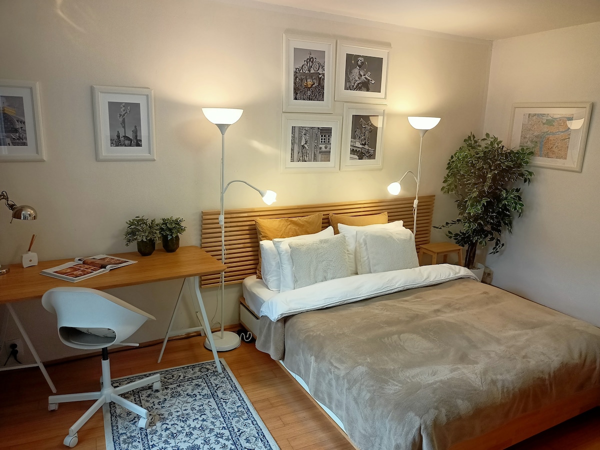 You will be welcome in this bright and stylish apartment in quiet surroundings a short bus or tram ride from the city centre. One or two guests can sleep in the bedroom, with a further one or two on a sofa bed in the living room. I treat my guests as I like to be treated when travelling, which means local tips and flexible check-outs whenever possible.