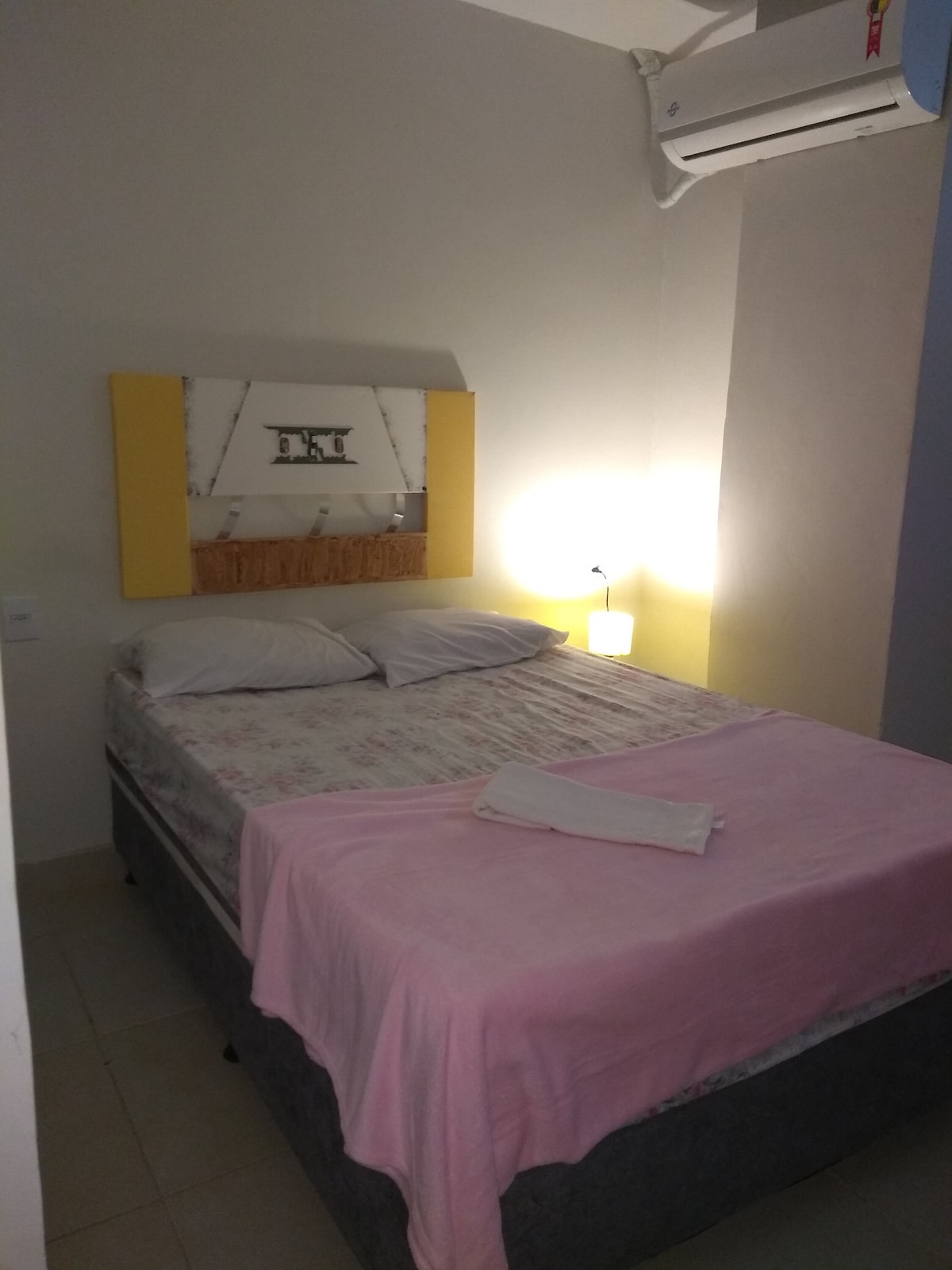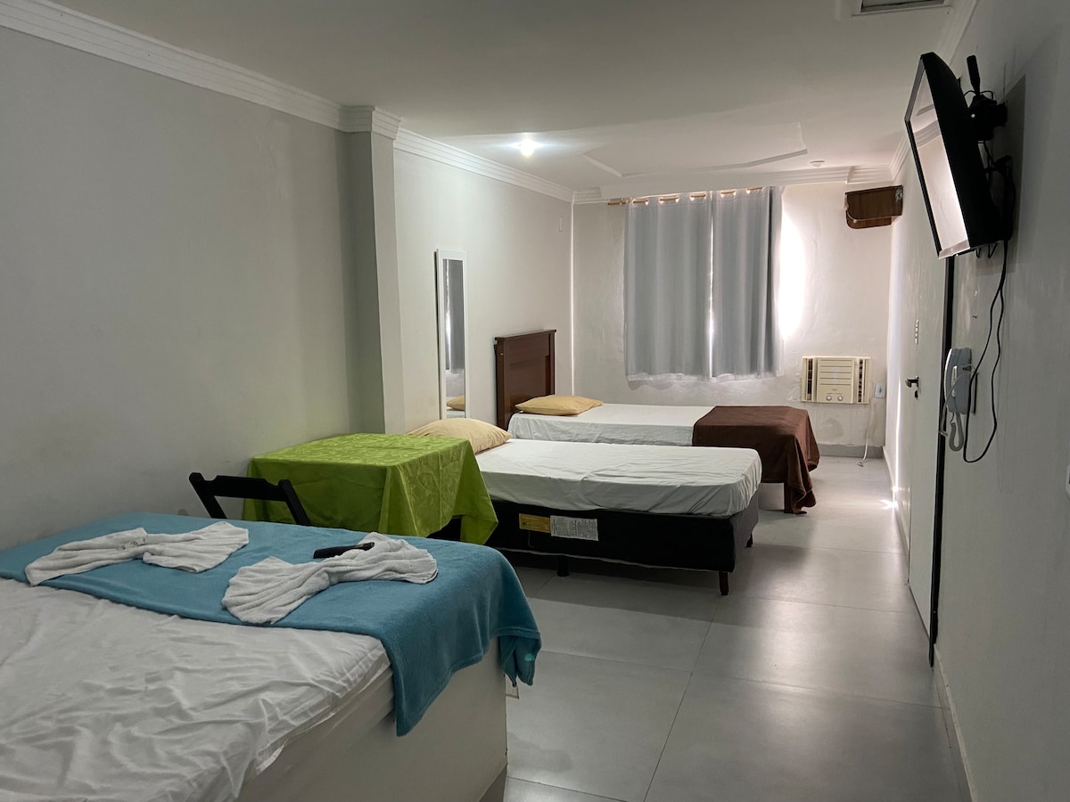 Suíte compacta com ar condicionado split equipada com: 01 banheiro privativo 01 cama de casal 02 camas de solteiros 01 tv de 32 polegadas 01 frigobar