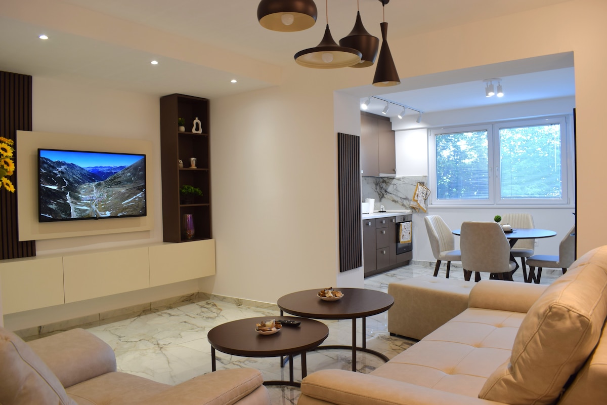 Enjoy a stylish experience at this centrally-located place This is BRAND NEW 60m2 apartment 5 minutes on foot from city park (stadium) and from the main square. Best possible location, very close to the lovely streets of Debar Maalo with many bars and restaurants. The apartment is with 1 bedroom with queen sized bed, and a living room with comfortable sofa bed + pull out bed Also 2 balconies from both rooms, one overlooking Vodno mountain. You can use it to drink a coffee or have a lunch
