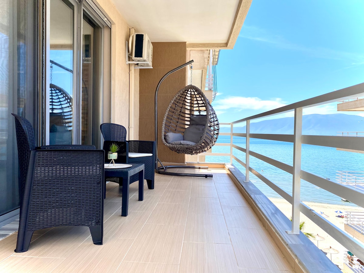 Closest apartment to the beach in Vlorë you will ever find! Perfect for families and couples. With stunning panoramic views from the 2 balconies and all the luxuries like AC, fully equipped kitchen, Smart-TV, free bicycles etc. to give you a memorable holiday! Most apartments in Vlorë are separated from the sea by a busy, dangerous and load road. Only a handful of places like this one have the luxury to have a road behind the building instead of in the front. What makes this place superior!