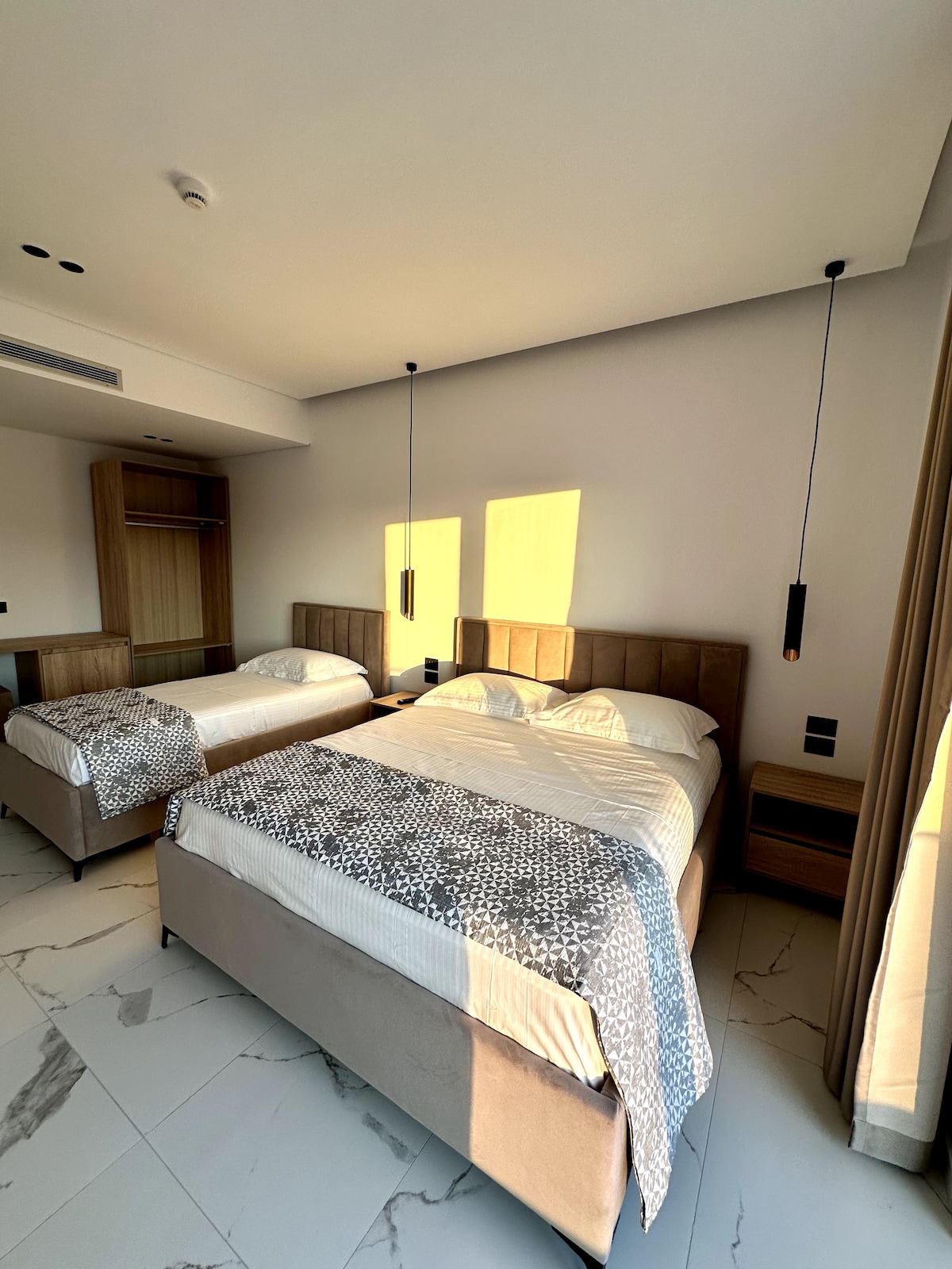 The Superior Triple Room with a Sea View Balcony at E'Lux Seaside Suites Vlora offers a spacious & elegant retreat, featuring a super king-size bed, a single bed, a smart TV, and a fully renovated luxury bathroom. The room is designed with comfort in mind, offering premium bedding and modern amenities. Ideal for up to three guests can accommodate infant in cot. Relax on the balcony & enjoy stunning views of the surrounding area. The perfect blend of luxury and convenience for your stay in Vlora.