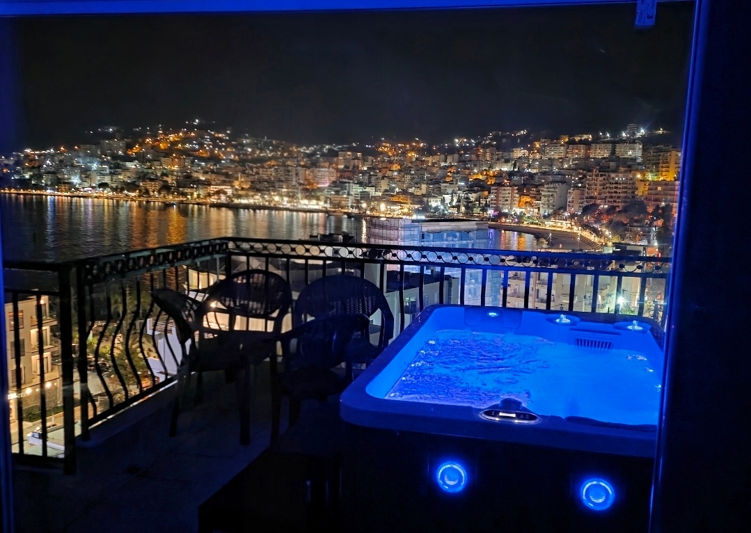 Sunny and panoramic apartment offers the most spectacular views of Vlora Bay. You can enjoy the stunning blues and greens of the sea and to feel the comfort and peace in the most coveted area.The residence where the house is located is newly built, the apartment total area is 120m2 and has two balconies overlooking the sea. One balcony belongs to the living area and the kitchen, while the other to the matrimonial room, the apartment has another room furnished with 2 single beds.