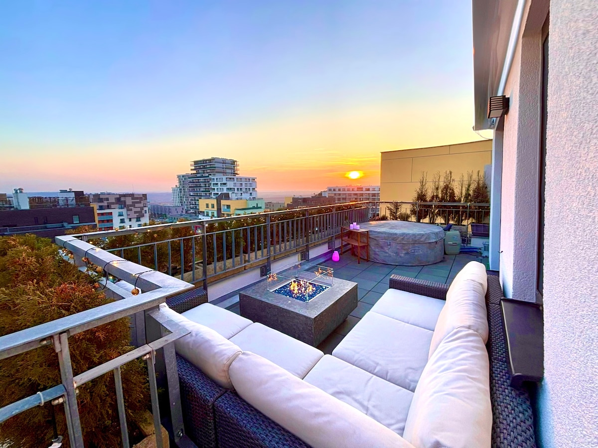 Nový moderní apartment, nacházející se v klidné častí Prahy v bezprostřední blízkosti parku a zároveň vzdálený jen 15 minut od centra Prahy. Je vhodný pro 2 osoby vyhledávající ruch velkoměsta a zároveň si po namáhavém dni chtějí nerušeně užít příjemný večer s posezením na soukromé terase 30m2, pod pergolou ve vlastní vířivce s celoročně vyhřívanou vodou či relaxovat v prostorné privátní sauně. Ke zpříjemnění romantiky stačí jen zapnout elektrický krb. Parkování zdarma. ve společné garáži.