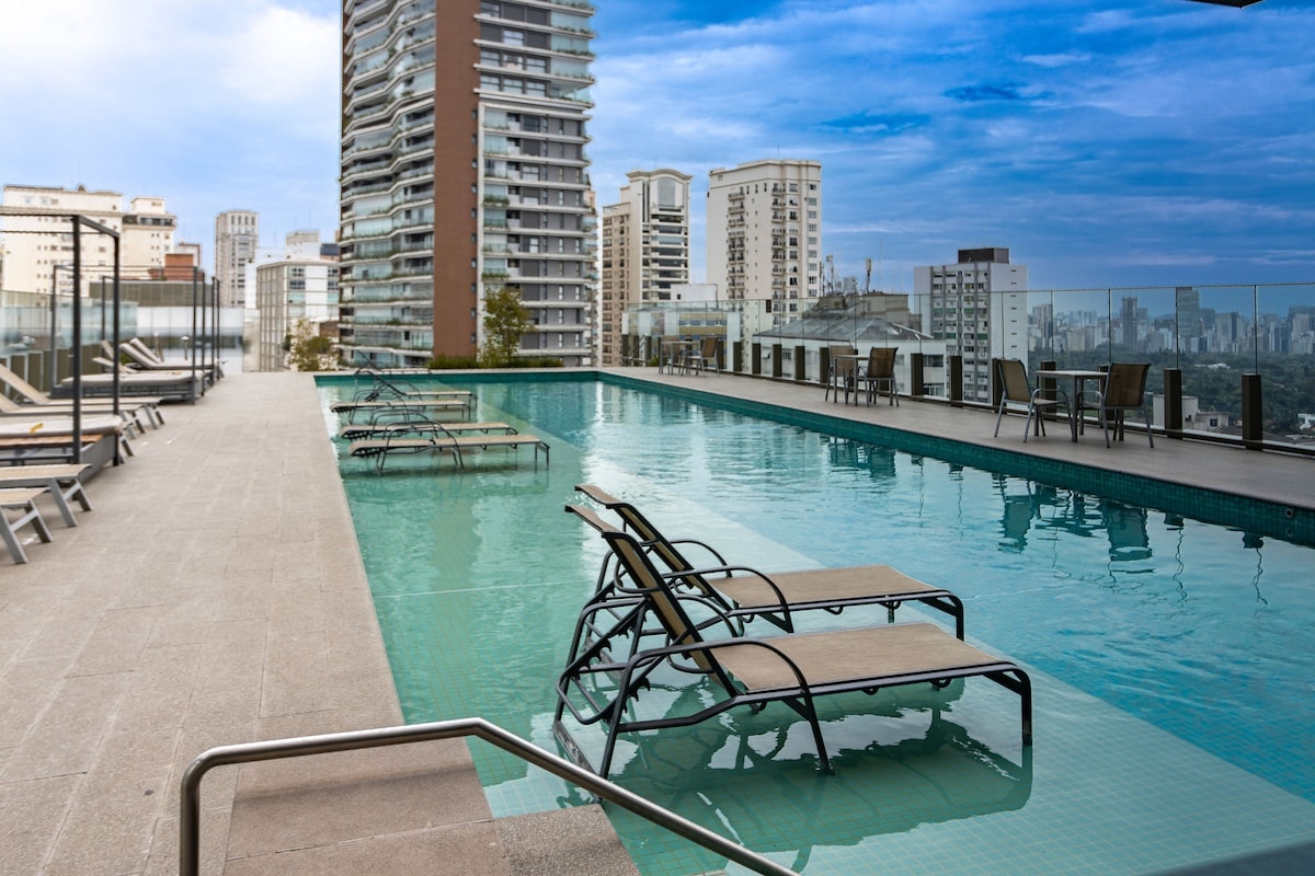 Excelente Localização Região Nobre e Descolada Situado a poucos metros da renomada R. Oscar Freire e do sofisticado CJ Shops, cercado pelo que há de melhor na cidade: os mais aclamados restaurantes, bares, farmácias, salões de beleza e parques . Desfrute de uma vista livre, com um toque de verde que traz serenidade ao seu dia. A rua é reconhecida por ser segura e tranquila, garantindo sua comodidade e paz. *WI-FI de alta velocidade e acesso a NETFLIX. •Importante: Não somos um hotel