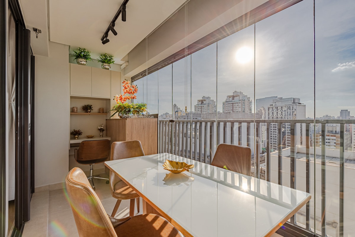 Confy design Spa apartment. You'll have your onw private sauna and ofurô with an incredible view of the São Paulo DownTown Dedicated exclusively for guests. Área privativa de 82m2 e se localiza em um edifício de construção nova, da construtora Cyrela, com acabamento em alto padrão, com segurança e portaria 24h. Há apenas 50 metros de distância há um supermercado que funciona 24h por dia, de domingo à domingo. O metrô fica na esquina, há apenas 100 metros do edifício.