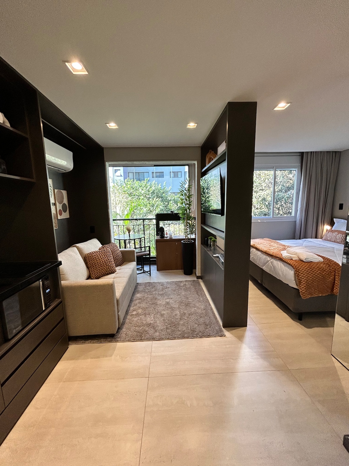 Experience One Eleven in Vila Olimpia. This modern apartment features large windows with breathtaking city views and natural light. The unit boasts 600 Mbps internet and a 4K HD TV. For total comfort, it has a Hot/Cold AC system: 27,000 BTU/h unit in the living room and 10,000 BTU/h in the bedroom. The bedroom is quiet and dark for a restful sleep. Impeccably maintained, you’ll be walking distance to top restaurants and business hubs—a safe, upscale retreat with a stunning urban backdrop.