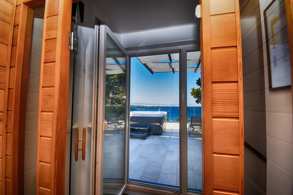 Villa Punta - Luxury sea view penthouse with roof terrace, private jacuzzi and infrared sauna.Designed Penthouse with 2 bedrooms, 2 bathrooms, private entrance and kitchen with second terrace.Villa has outdoor shared pool, gym, parking. Excellent location! Everything is near by villa (restaurants, beach,shops, rent a bike or car, bakery) and that what makes it so special! Unique location with unique equippment.First beach is only 50m away and center Vodice is 120m. Residental part of Vodice!