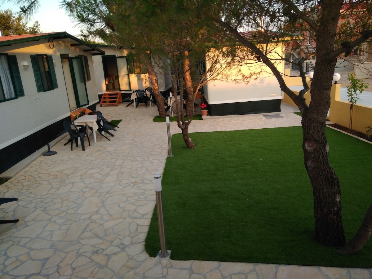 Mobile homes situated in the center of Pakostane right on to the main sandy beach with the direct view on the sea. Holiday home 5 has one bedroom, dinning area, kitchen, toilete and big terrace. Also parking place is provided for guests.