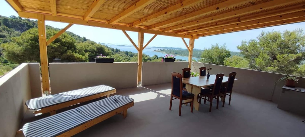 IMPORTANT: select your period - festival goers (thegardencroatia .com/events) or families. 1 night FREE for 14+ day stays Modern (2023) and stylish bungalow, with all the amenities and parking. Direct sea view from the spacious terrace tucked amidst olive and oak trees. Secluded beach, at a bay on the brink of the Kornati islands. Peaceful and quiet area, perfect for groups who want to relax and unwind. Nearby attractions by car. Perfect for groups of 4, with 2 bedrooms and bathrooms.