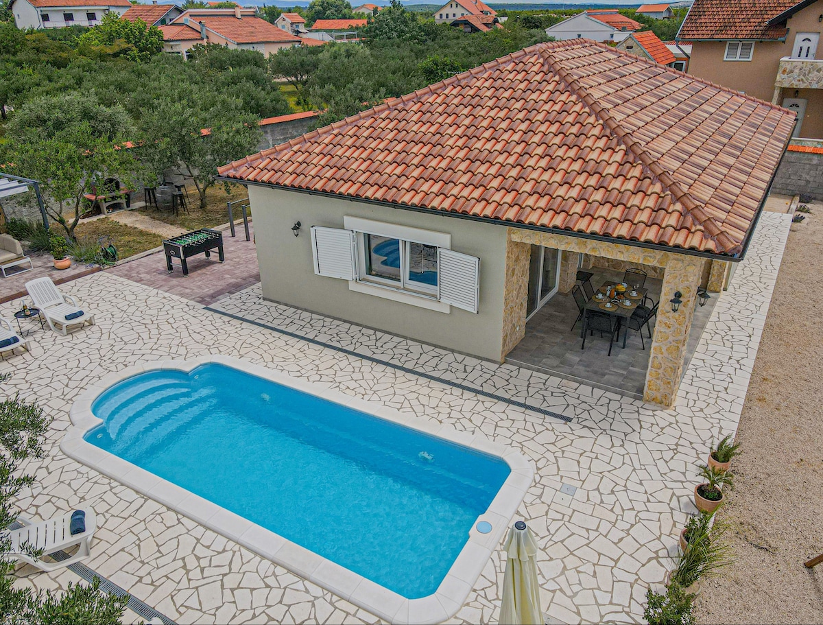 Beautiful, intimate house ideal for holidays with family or friends. We are located in a quiet place Čista Velika, only 10 km from the sea and the town of Vodice,Šibenik. The house has a capacity of 6 persons. We offer 3 rooms, of which 2 rooms with a double bed and their own toilet and 1 room with a bunk bed. There is a large living room, kitchen and outdoor pool The house has: Jacuzzi 0-24 Wi-fi Satellite Grill Darts Outdoor gym Table soccer Table tennis Trampoline Badmiton Pikado Parking