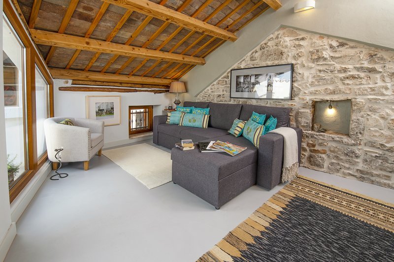 Our apartment is stone house on two levels brimming with character and restored with respect for its innate simplicity. All rooms are furnished to excellent standard, in an elegant country style with original beds. House contains 3 bedrooms and each has a bathroom with shower. There is a fully equipped kitchen with a dining table. In living room there is a flat screen TV and folding sofa. Outside of the house there is terrace. Every room has air conditioning and access to free WI-FI.