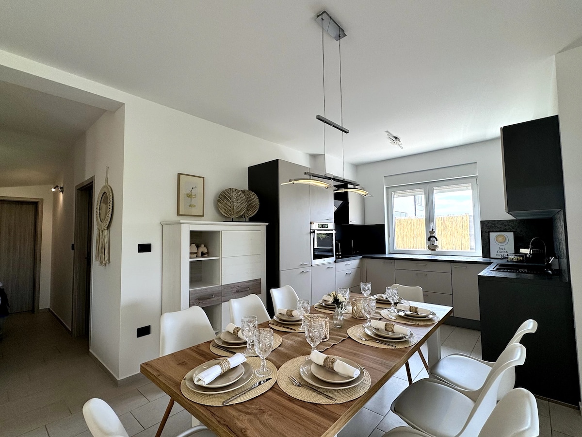 Nova vila sa 2 spavaće sobe, 2Wc, 110 m2, 15 km od mora i 200 m od trgovine. Moderno namještena: *dnevni boravak/blagovaona SAT TV, WIFI i klima uređaj. Izlaz na terasu, na bazen. Kuhinja (indukcija ploče za kuhanje, pećnica, perilica za suđe, mikrovalna pećnica, zamrzivač). *1 soba s 1 bračnim krevetom i 1 krevetom za 1 osobu, tušem/WC-om i klima uređajem. *1 soba s 1 bračnim krevetom i klima uređajem, *1 glavna kupaonica s tuš/WC. Terasa, vrtni stol, ležaljke, plinski roštilj.