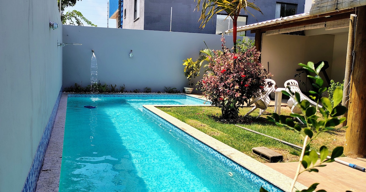 Apartamento térreo, possui 2 quartos com ar, 1 banheiro, sala de jantar, cozinha, área de serviço e 1 vaga de garagem. O condomínio dispõe de piscina (fechada na segunda para manutenção), academia, sauna, salão de jogos e quadra de esportes. Disponibilizamos roupa de cama e banho, utensílios de cozinha, ferro de passar, secador de cabelo e sabonete. O Apê está situado a 200 m da Praia dos milionários, 4 km do Aeroporto e a 10 min do centro histórico da cidade. Será um prazer receber vocês!