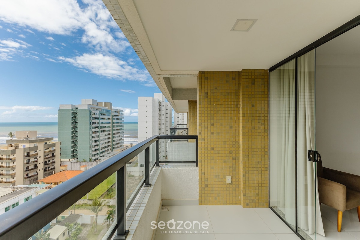 Localizado em frente à Praia, próximo à SmartFit, ao Atacarejo, além de cafés e restaurantes. Possui uma suíte com cama de casal “queen size”, outro quarto com duas camas de solteiro, ambos com ar condicionado split, TV por assinatura, “Wi-Fi”, cozinha, área de serviço e varanda, com vista para o mar de todos os quartos. Possui segurança eletrônica, elevador panorâmico, duas garagens para carros de médio porte, espaço kids, salão de jogos, espaço gourmet, academia, sauna e piscina.