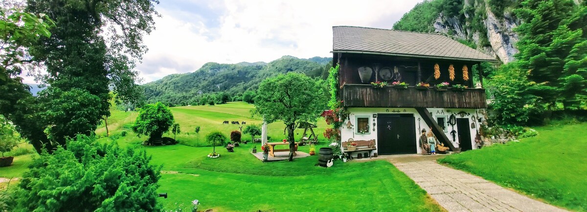Our house, located in the wild nature of Triglav National Park, is surrounded by a forest and beautiful mountains. Just under the house you can explore amazing water grove and a waterfall, which is known as energy point. In the valley you can enjoy the beauty of emerald green Soča gorge and if you're brave enough, you can jump right in. The house is a great starting point for many hiking trips. The most popular is certainly the hike to a beautiful glacial lake Krn, under the top of mountain Krn.