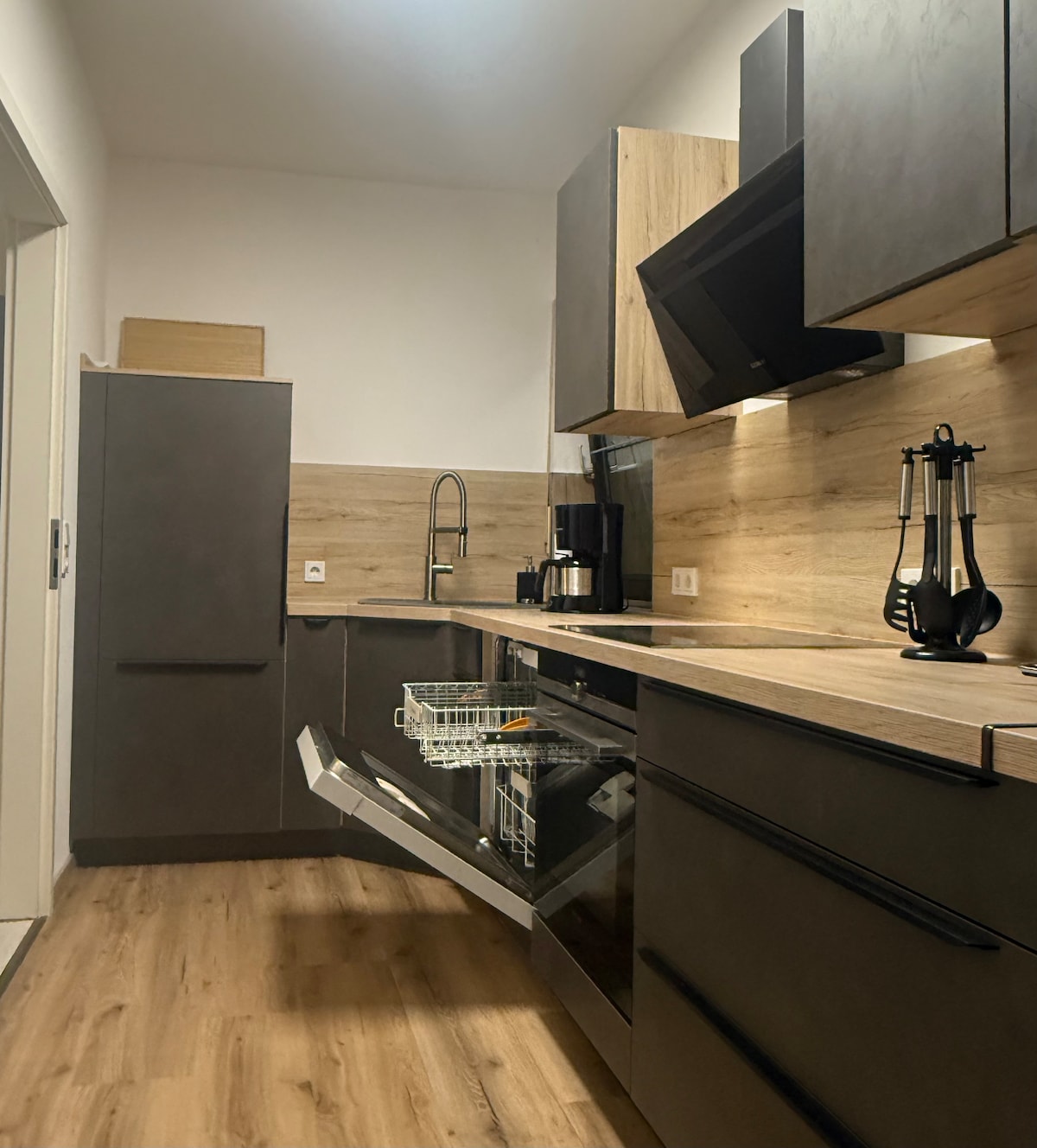 Die 60qm Wohnung ist frisch renoviert und teilweise neu möbliert: ein Schlafzimmer, Bett 160*200cm ein Badezimmer, mit Badewanne/Dusche eine voll ausgestattete Wohnküche mit Nespresso-Kaffeemaschine, Geschirrspüler, Couch, Smart-TV, Apple-TV, Amazon-Prime ein Zimmer, das wahlweise als : - Arbeitszimmer mit Schreibtisch, Monitor, Stuhl - Kinderzimmer mit Kinderbett oder Krippe eingerichtet wird Internet 1TB/s Waschmaschine, Trockner und andere Sachen stehen in dem Keller.