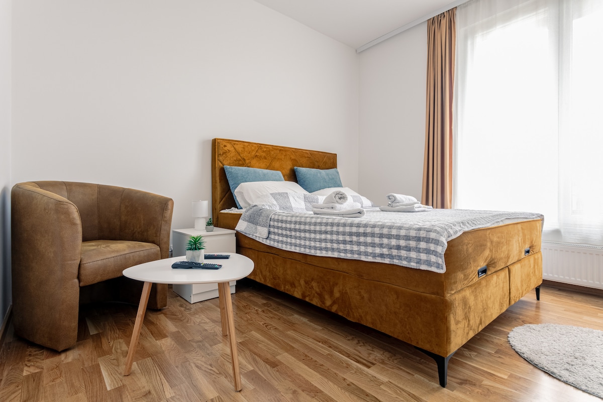 Dear Guests, Bright apartment, perfect for business trips and short and long term vacation stays. Freshly renovated and well equipped. The Danube, a large park for nice walks and the beautiful beach are near (10 minutes walk; perfect for a morning run). The City centre, Fair and University are 20 minutes away walk. Cafes, supermarkets and good shopping are in the near vicinity as well! Parking is free right next to the building. Please Note that everyone is welcome! :)