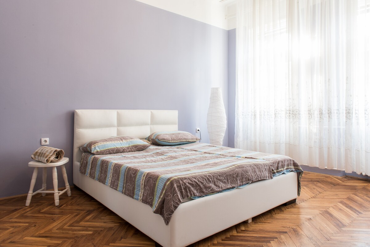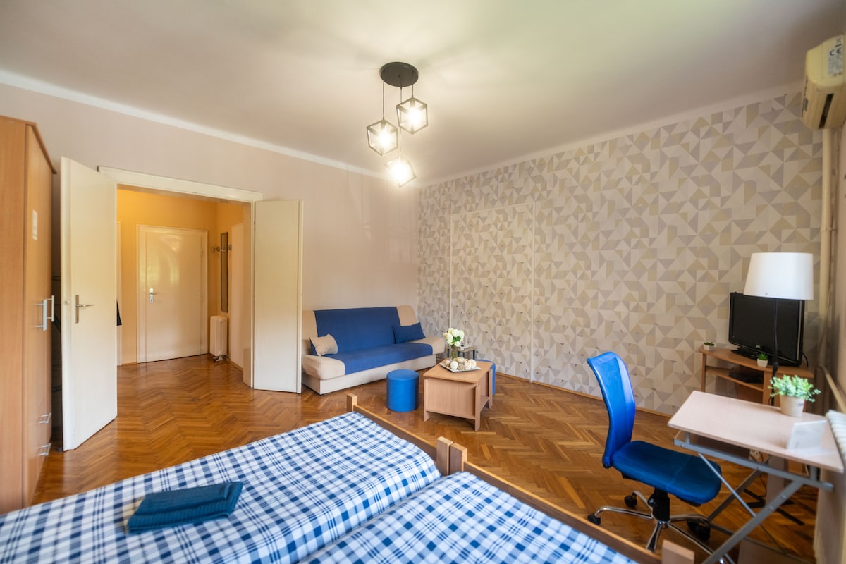 Quiet 43sqm studio in Vracar neighbourhood, close to St Sava Temple. One double bed and one double sofa-bed, with extra pillows and blankets available. Corner kitchen and separate refurbished shower room. Wifi, cable TV, and kitchen table for working. Free parking available on street.